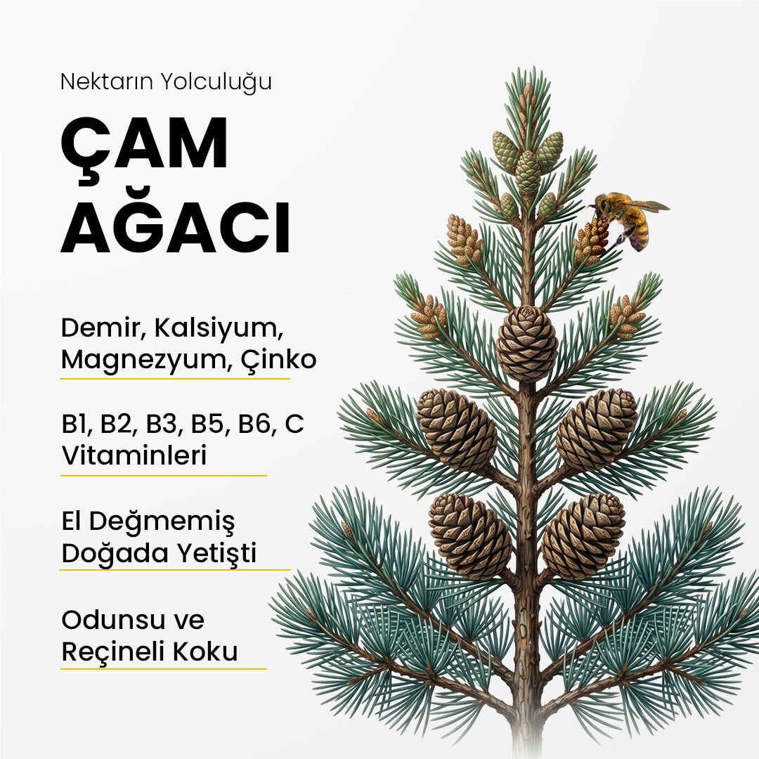Bu salgı balı, floral ballara göre daha koyu renge, yoğun kıvama ve tok bir lezzet profiline sahiptir. Çam Balı, hızlı kristalize olmayan bir yapıya sahiptir.
