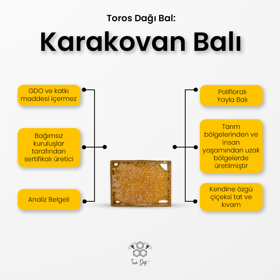 Böylece karakovan balı, kovandan çıktığı haliyle, işlem görmeden ve süzülmeden doğrudan tüketiciyle buluşur. Bal mumu, yapısı gereği ağız ısısıyla yumuşayarak sakızımsı bir kıvam alır; bu nedenle ağızda erimemesi son derece doğaldır ve ürünün doğal olduğunun göstergesidir.
