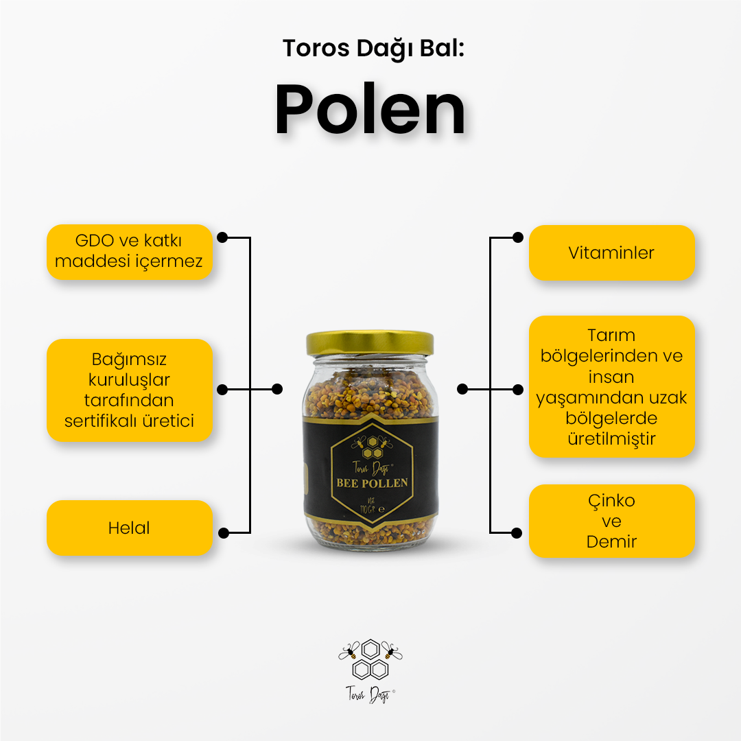 Sarıdan turuncuya, hatta mor tonlarına kadar değişen renkli yapısıyla her kavanoz, doğanın çeşitliliğini ve canlılığını yansıtır. Polen, doğal olarak yüksek oranda protein içerir ve aynı zamanda potasyum, magnezyum, çinko, demir gibi mineraller bakımından da zengindir.